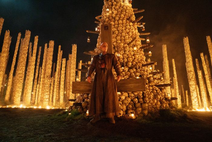 I do know it sounds hyperbolic and as if I’ve the reminiscence of a mayfly after I say Ralph Fiennes’s efficiency in The Bone Temple could be the very best factor he’s ever finished. However by the tip of Nia DaCosta’s sequel to the Danny Boyle–directed 28 12 months Later, I began to imagine it. On the very least, it’s the most Ralph Fiennes flip potential, and never within the sense that he’s doing a ton of capital-A performing, although at one level — spoilers, and there are going to be quite a lot of them on this piece — he does a pyrotechnic-enhanced dance quantity to Iron Maiden whereas passing himself off because the Satan himself. Slightly, it’s the efficiency that calls on the totality of Fiennes’s totally different strengths as an actor, from his easy ease with taking part in sinister to his capability for sentimentality to the willingness to get bizarre that he has leaned into increasingly more as he’s gotten older. Dr. Ian Kelson, GP turned set up artist establishing a monument to human mortality out of human bones, was a beguilingly unusual character in 28 Years Later, which prolonged the 28 Days Later franchise right into a close to future when the British Isles have been quarantined from the remainder of the world for the reason that second Rage Virus outbreak. However he’s nothing lower than the rueful soul of its sequel, a person conscious that he has turn out to be a sort of memento mori himself, one among a dwindling few who keep in mind what life was like earlier than civilization imploded and might recall the values individuals presumed they shared, nevertheless unsteadily. After pulling arrows from one of many contaminated, he fondly informs the senseless man that there’s no cost for the service as a result of Kelson’s a part of the NHS.
